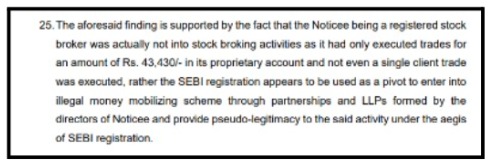 SEBI’s own conclusion, written in Para 25 of the order: the broker’s registration “appears to be used as a pivot to enter into an illegal money mobilising scheme and provide pseudo-legitimacy under the aegis of SEBI registration.”