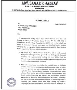 On June 26, 2024, a formal legal notice arrived from Advocate Sagar R. Jadhav (Bombay High Court) on behalf of Infinite Beacon India Pvt. Ltd.
