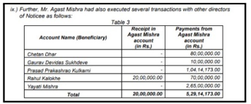 From Agast Mishra’s account, funds flowed to other Trdez directors: ₹2.65 Crore to Yayati Mishra, ₹1.04 Crore to Prasad Kulkarni, ₹70 Lakh to Rahul Kalokhe, ₹80 Lakh to Chetan Dhar, and ₹10 Lakh to Gaurav Sukhdeve.