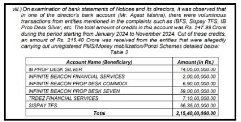 Of this, ₹215.40 Crore came directly from the Ponzi entities: IB Prop Desk Silver (₹74.05 Cr), Sispay TFS (₹66.35 Cr), Infinite Beacon Prop Desk Seven (₹59 Cr), Trdez Financial Services (₹7.10 Cr), Infinite Beacon Prop Desk Commodity (₹6.90 Cr), and Infinite Beacon Financial Services (₹2 Cr).