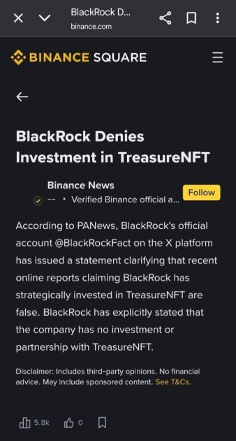 लेकिन जैसे ही आप नीचे दिए गए दूसरे स्क्रीनशॉट को देखेंगे, सच्चाई सामने आ जाती है। BlackRock ने साफ़ शब्दों में deny किया है कि उनका Treasure NFT से कोई भी संबंध है। यानी पार्टनरशिप का दावा पूरी तरह झूठा है।
