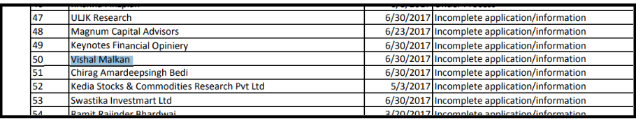 No personal SEBI registration for Vishal Malkan. Application rejected for incomplete documentation.