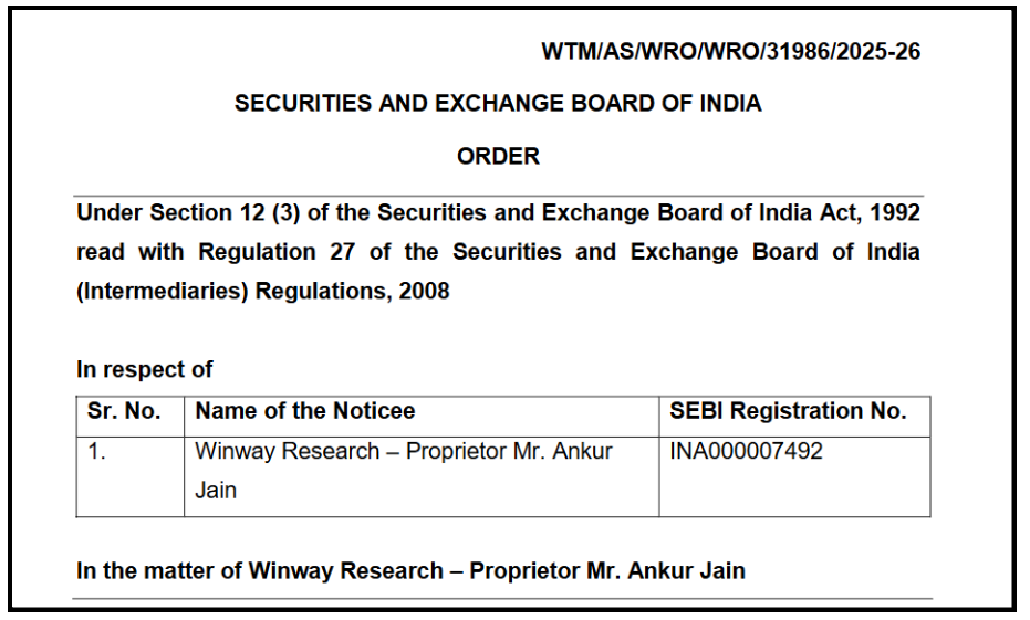 Regulatory Censure Issued: A formal reprimand has been issued to Winway Research – Proprietor, Mr Ankur Jain.