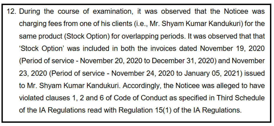 The Noticee charged a client, Mr Shyam Kumar Kandukuri, for the same service (“Stock Option”) during overlapping periods.