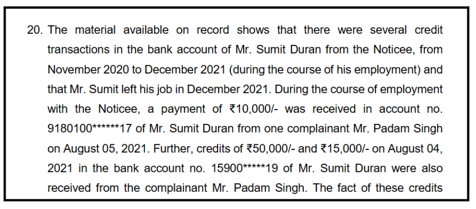 Transactions were traced from the complainant, Mr Padam Singh, to the employee’s account in 2021.