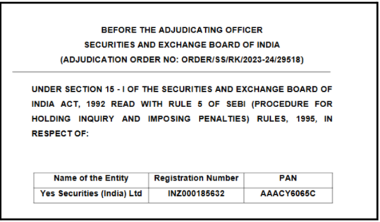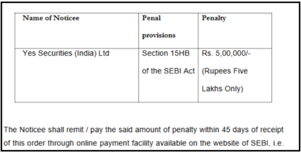 According to SEBI Adjudication Order No. ORDER/SS/RK/2023-24/29518, dated September 27, 2023, SEBI imposed a penalty of ₹5,00,000 on YES Securities (India) Limited under Section 15HB of the SEBI Act, 1992.