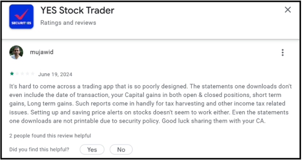 Real investor reviews add platform failures, including repeated instances of app glitches, along with concerns like YES Securities unauthorised trading, brokerage hikes without notice, and statement quality issues that affect actual tax compliance.