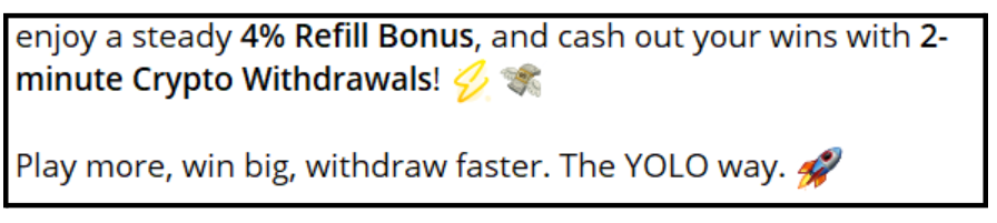 Messages state: “Play more, win big, withdraw faster. The YOLO way. “