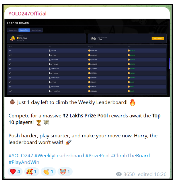 YOLO247 app is an online gambling platform that promotes betting and casino-style games primarily through aggressive Telegram marketing channels.