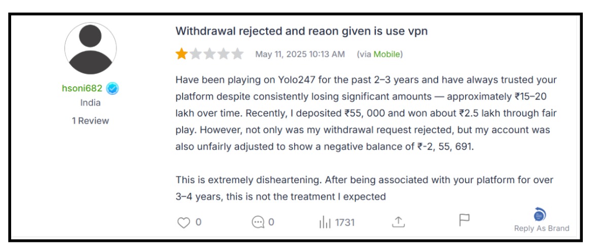 Your funds deserve platforms that honor withdrawal requests. YOLO247 app track record proves it doesn’t.